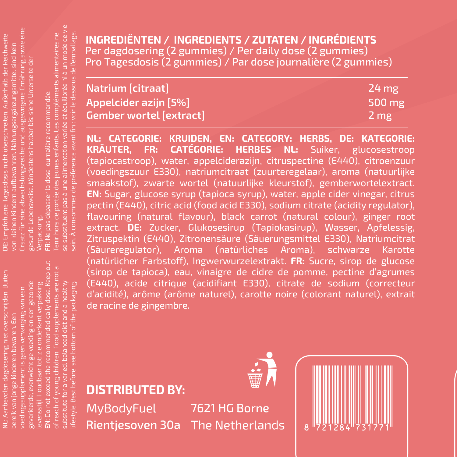 MyBodyFuel Apple Cider Gummies zijn ontwikkeld als een eenvoudige, plantaardige aanvulling voor dagelijks gebruik. De formule bevat 500 mg appelciderazijn per dagdosering en is verrijkt met gemberextract. De gummies zijn volledig plantaardig, vegan en GMO-vrij, en vormen een praktisch alternatief voor vloeibare appelciderazijn.